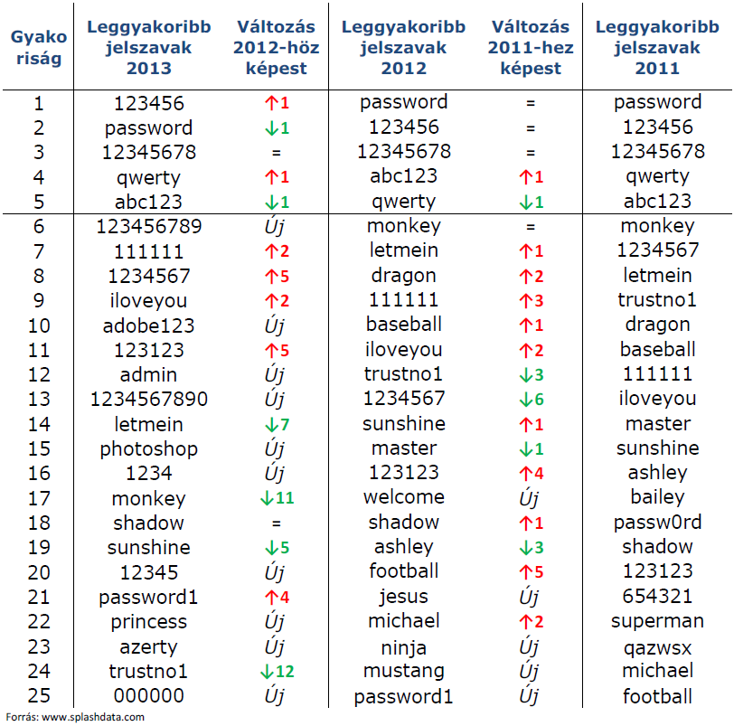 Az utolsó táblázatból látszik, hogy bár a sorrend változik, az első 5 helyen (a vizsgált 3 évben) ugyanazok a jelszavak találhatóak. Kedves Olvasó! A te jelszavad is ott van a táblázatban?