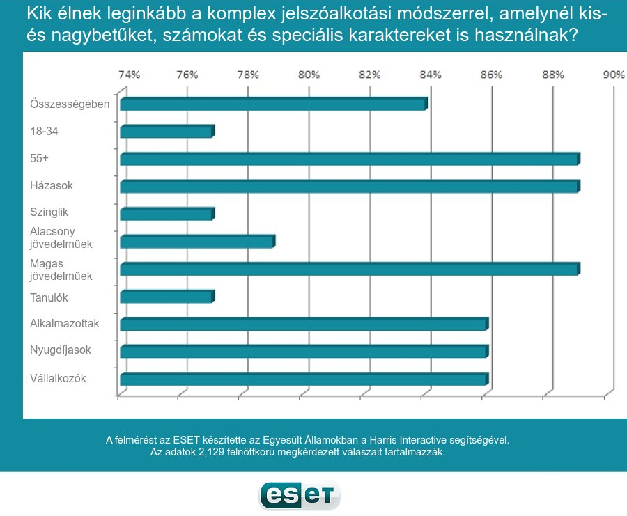 Komplexitását tekintve tartalmazzon kis- és nagybetűket, számokat és lehetőleg speciális (! " # $ % & ' ( ) * + , - . / : ; < = > ? @ [ ] ^ _ ` { | } ~) karaktereket is. Ez utóbbi karaktercsoport szintén jelentősen növeli a jelszavak biztonságát. Vállalati környezetben érdemes konzultálni a rendszergazdákkal, mert léteznek olyan alkalmazások, amelyek pl. az ékezetes vagy különleges karaktereket nem fogadják el!